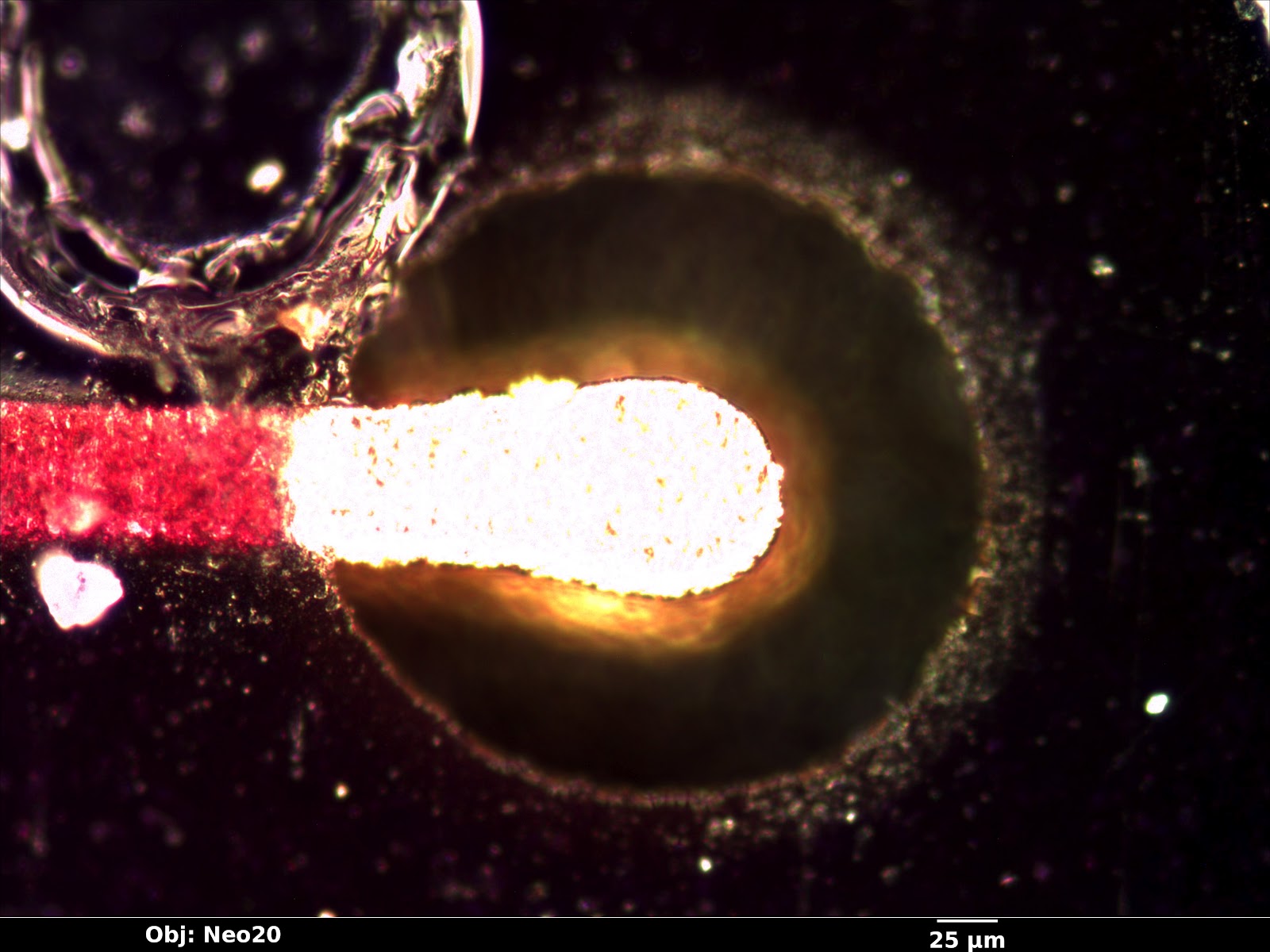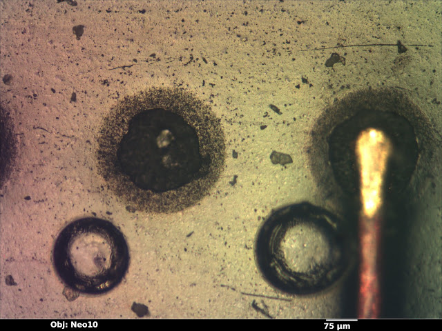 | Brightfield image showing empty hole in soldermask where a pad was etched away. Note strong glare from soldermask in brightfield mode. |