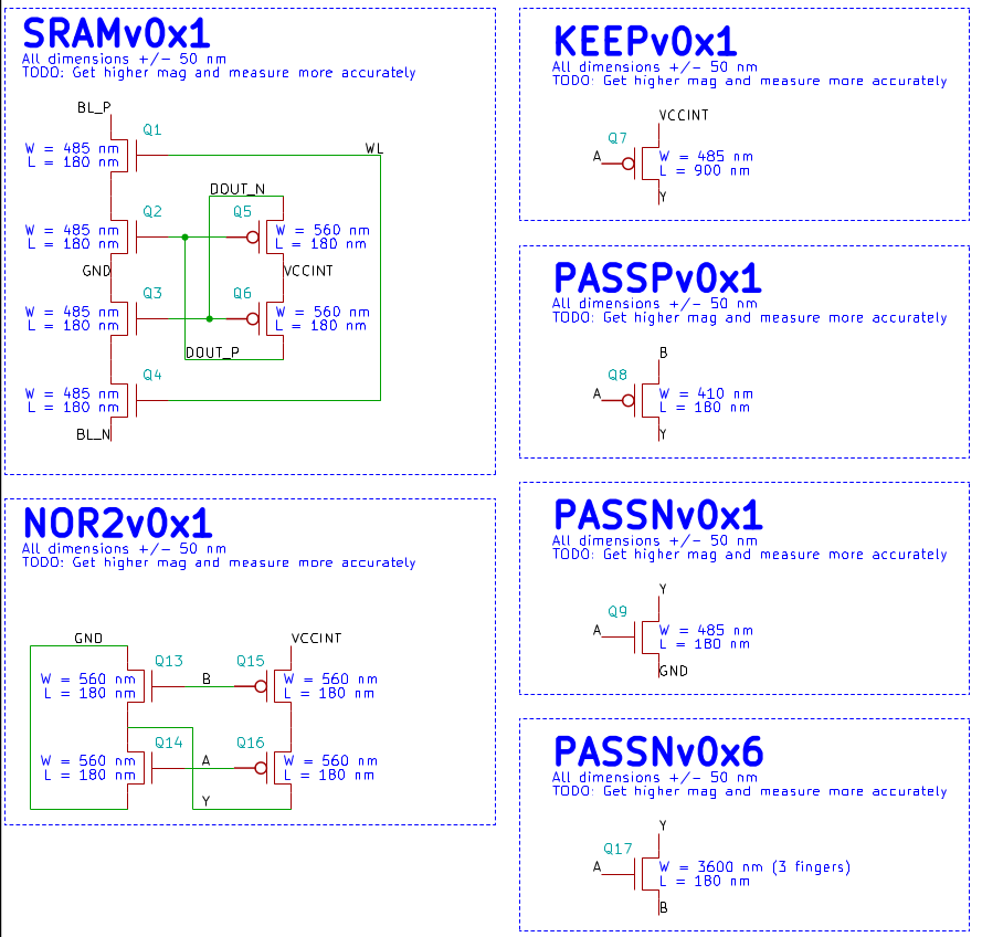 Looking at the actual mux logic showed that it was mostly tiles of the same basic pattern (a 6T SRAM cell, a 2-input NOR gate, and a large multi-fingered NMOS pass transistor) except for the far left side.